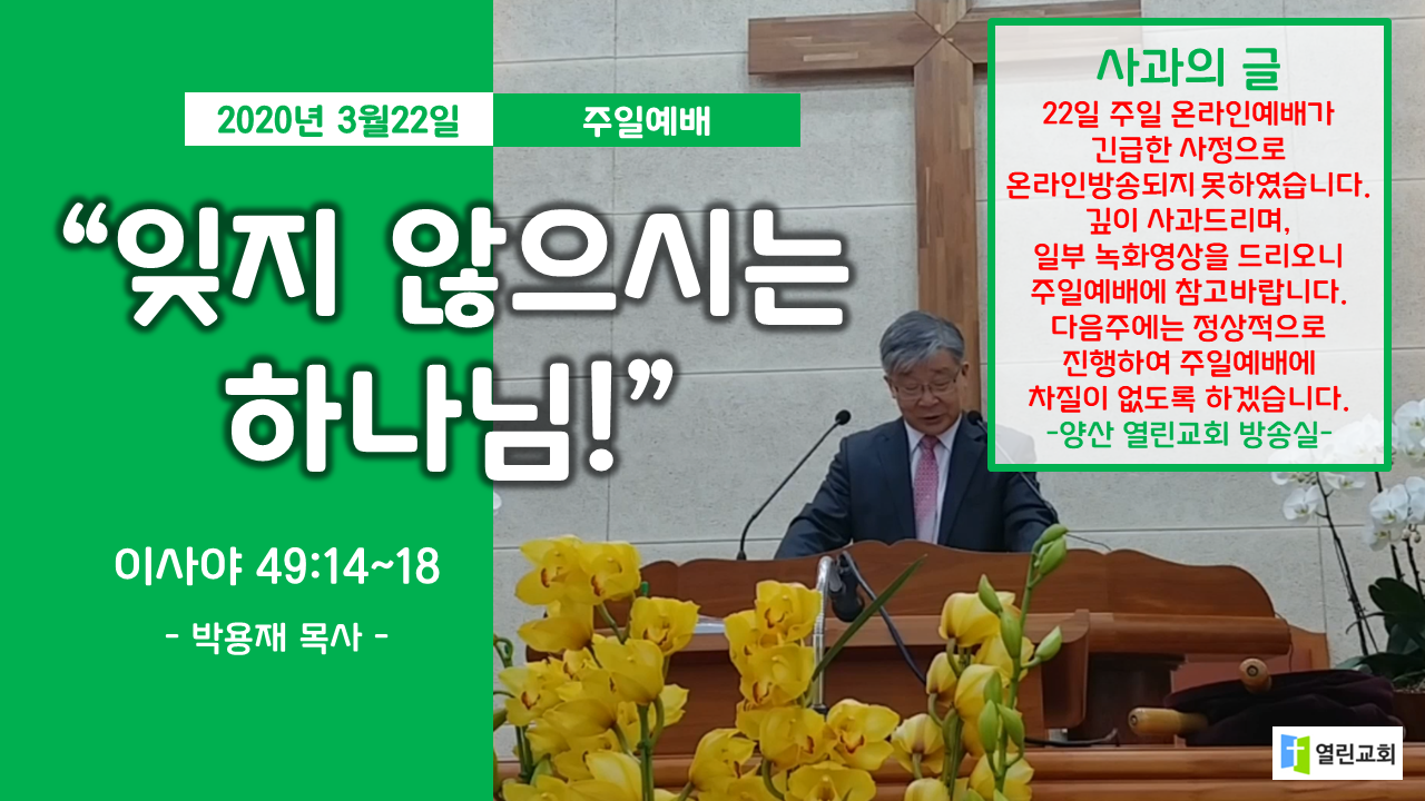 | 3월22일 주일예배 | 박용재목사 | 2020-03-22 | |||