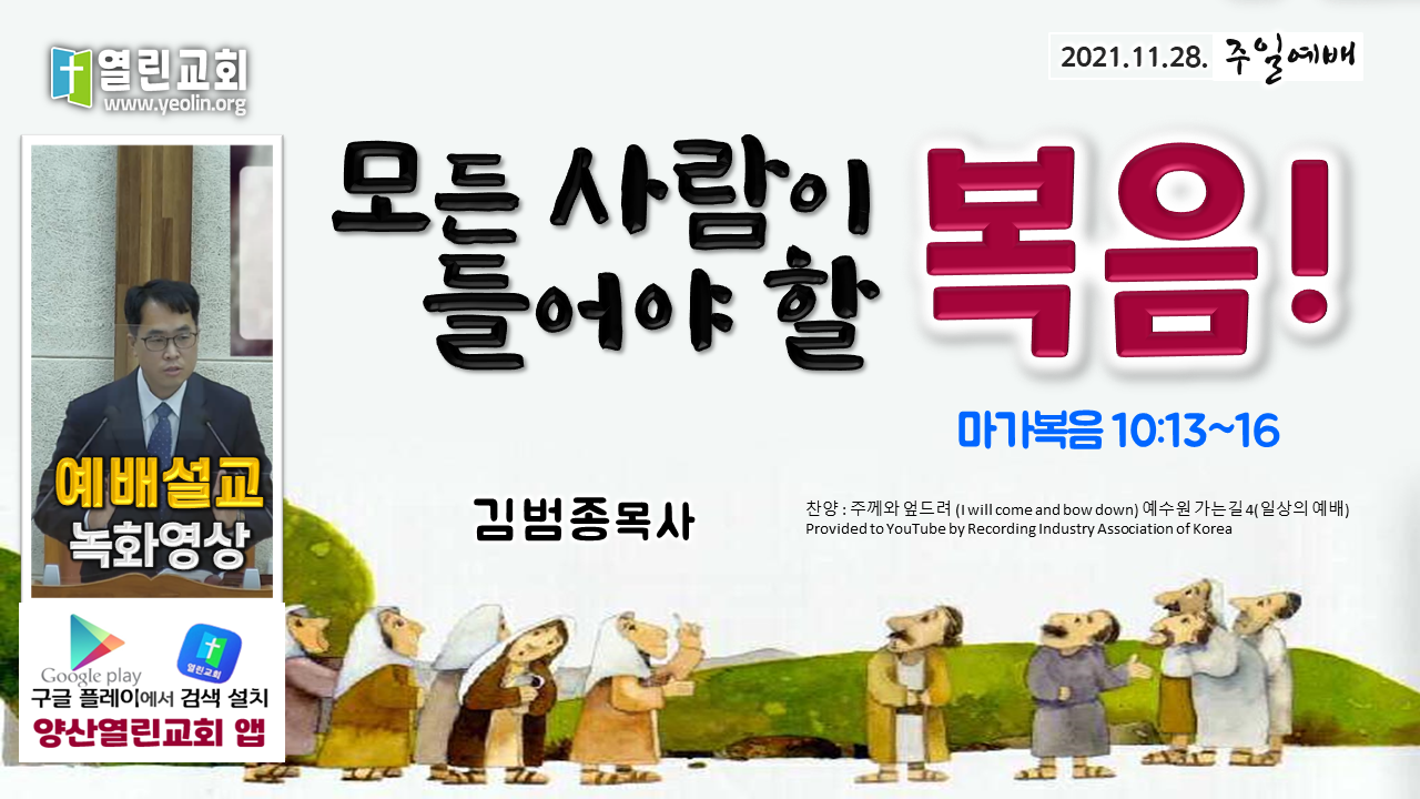 | 모든 사람이 들어야 할 복음(막10:13~16) | 김범종목사 | 2021-11-28 | |||